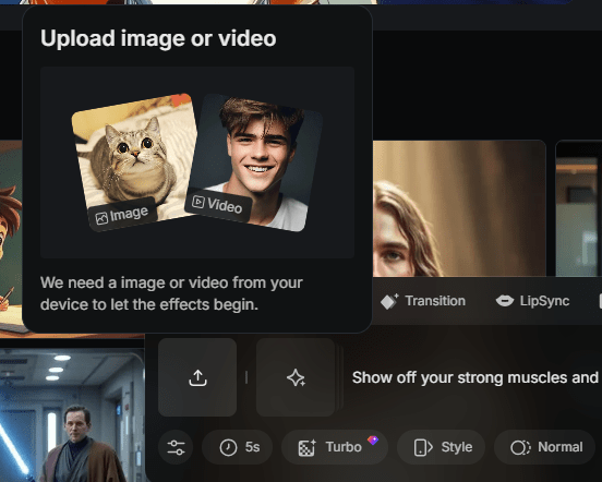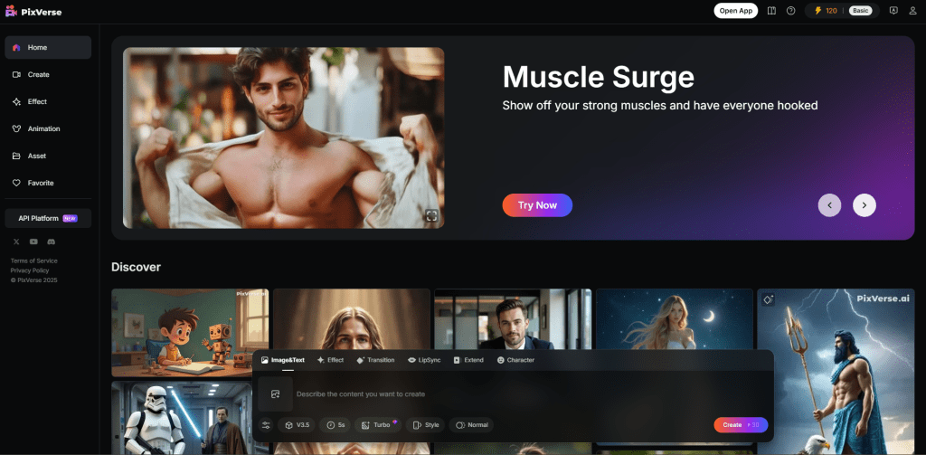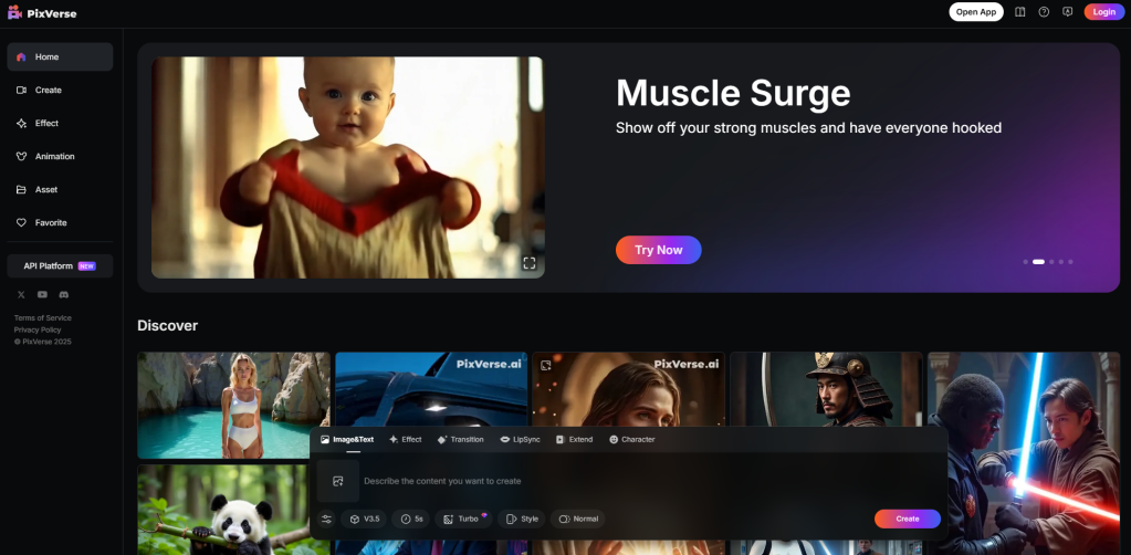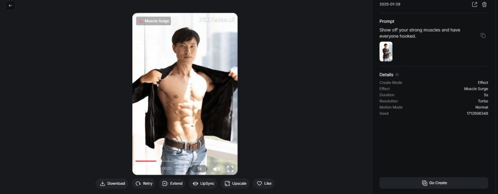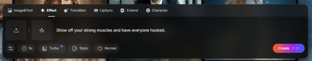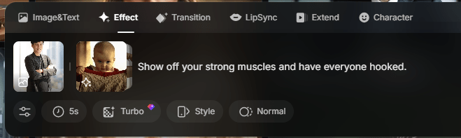 หรือตรงแถบนี้ กดคำว่า Effect กดปุ่มที่เหมือนรูปดาวเหนือ แล้วเลือก Muscle Surge เพื่อใช้ Pixverse AI กล้าม
